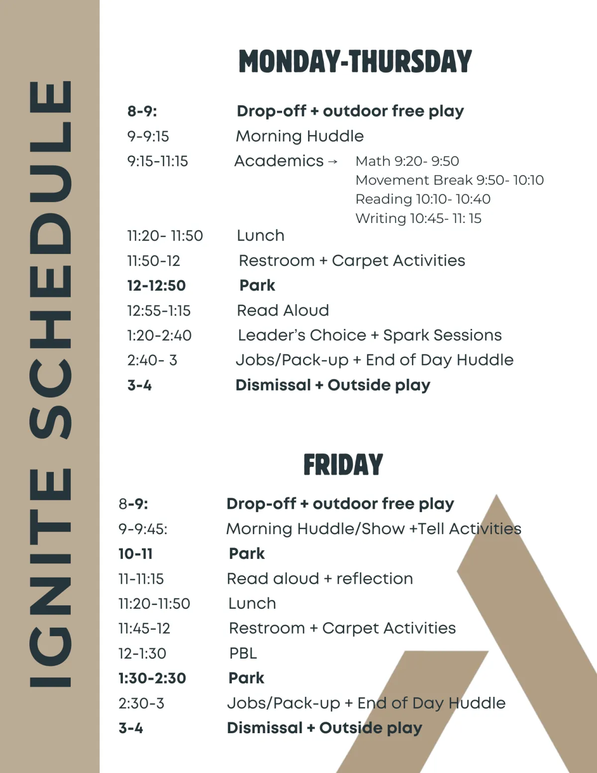 The Ignite Squad is designed to spark a lifelong love of learning through hands-on, experiential learning, free play, and exploration. The primary focus is on social-emotional growth, character development, and learning how to navigate relationships, responsibility, and conflict—skills that form the foundation for confident, self-directed learners. Academic skills in reading, writing, and math are intentionally built alongside this growth, supporting children as they learn how to think, make choices, and take ownership of their learning. With freedom within clear limits, students explore what works best for them, experience natural consequences, and are supported by Coaches throughout the process, while daily movement and active play promote physical growth and resilience.