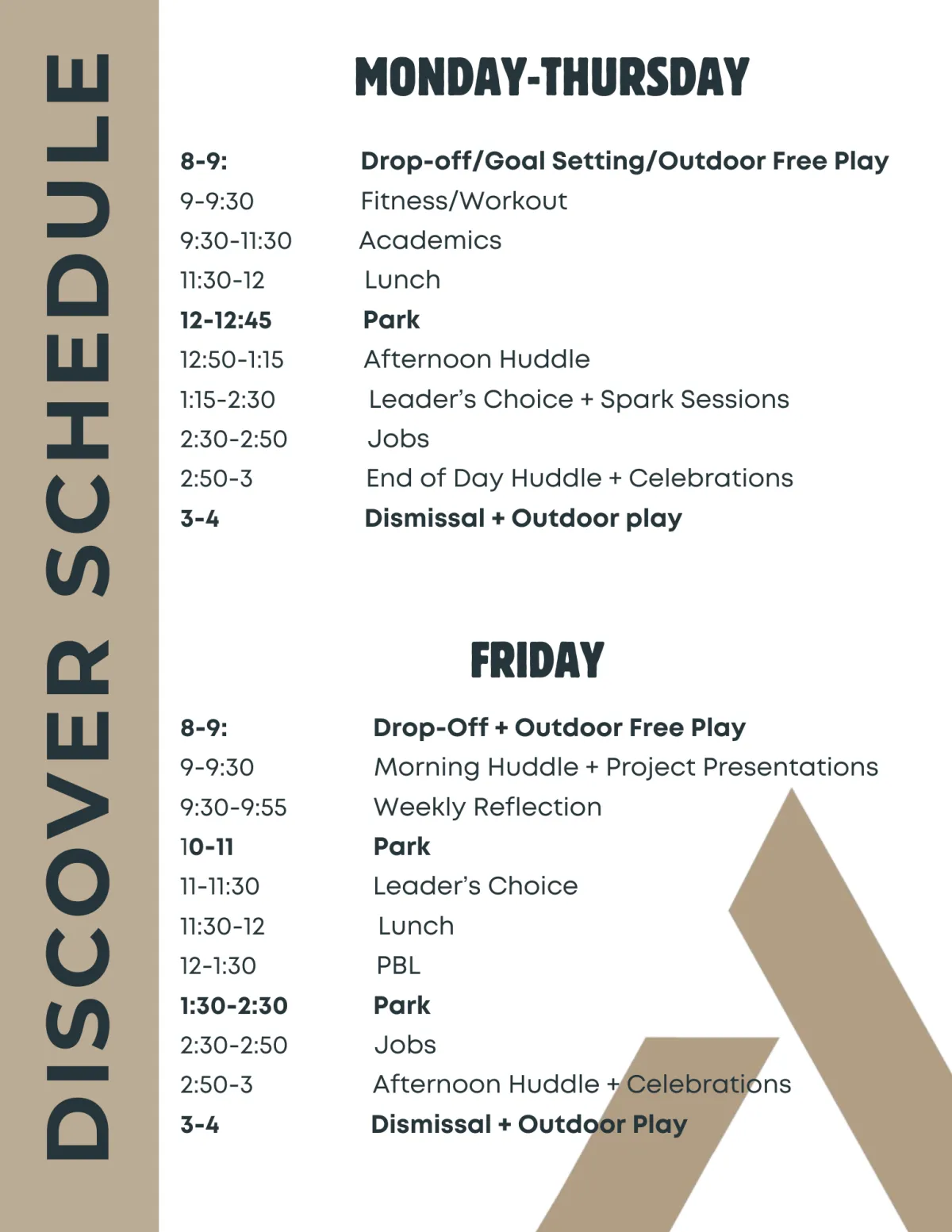 The Discover Squad is designed to strengthen character, responsibility, and leadership while helping students discover their passions through leader-led projects, challenges, and real-world experiences. As part of a tight-knit community, students collaborate daily and engage in meaningful discussions that build communication skills, respect, and stronger decision-making. With a strong focus on skill discovery and development, learners build confidence, problem-solving, and resilience as they learn to take ownership of their growth. Academics are self-directed and self-paced, allowing students to progress with support and structure while developing independence and strong work habits. Daily physical fitness is an intentional part of the program, supporting discipline, energy, and overall well-being.